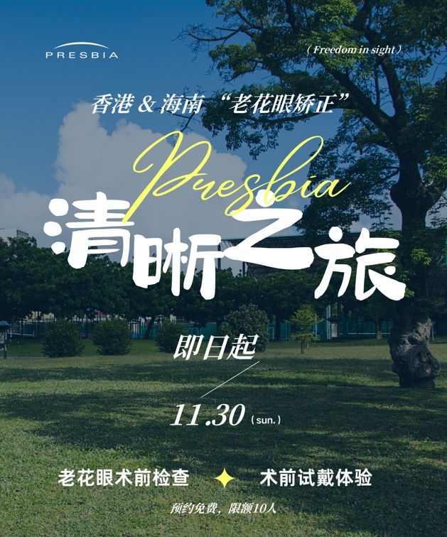 香港&海南联合推出“Presbia清晰之旅”老花眼矫正活动!即日起至11月30日,我们为您提供老花眼术前检查及术前试戴体验,让您提前感受清晰视界的美好。让我们一起告别老花眼的困扰,迎接全新的视觉体验,专业医生将为您进行详细的术前检查,确保您的眼睛适合进行矫正手术。