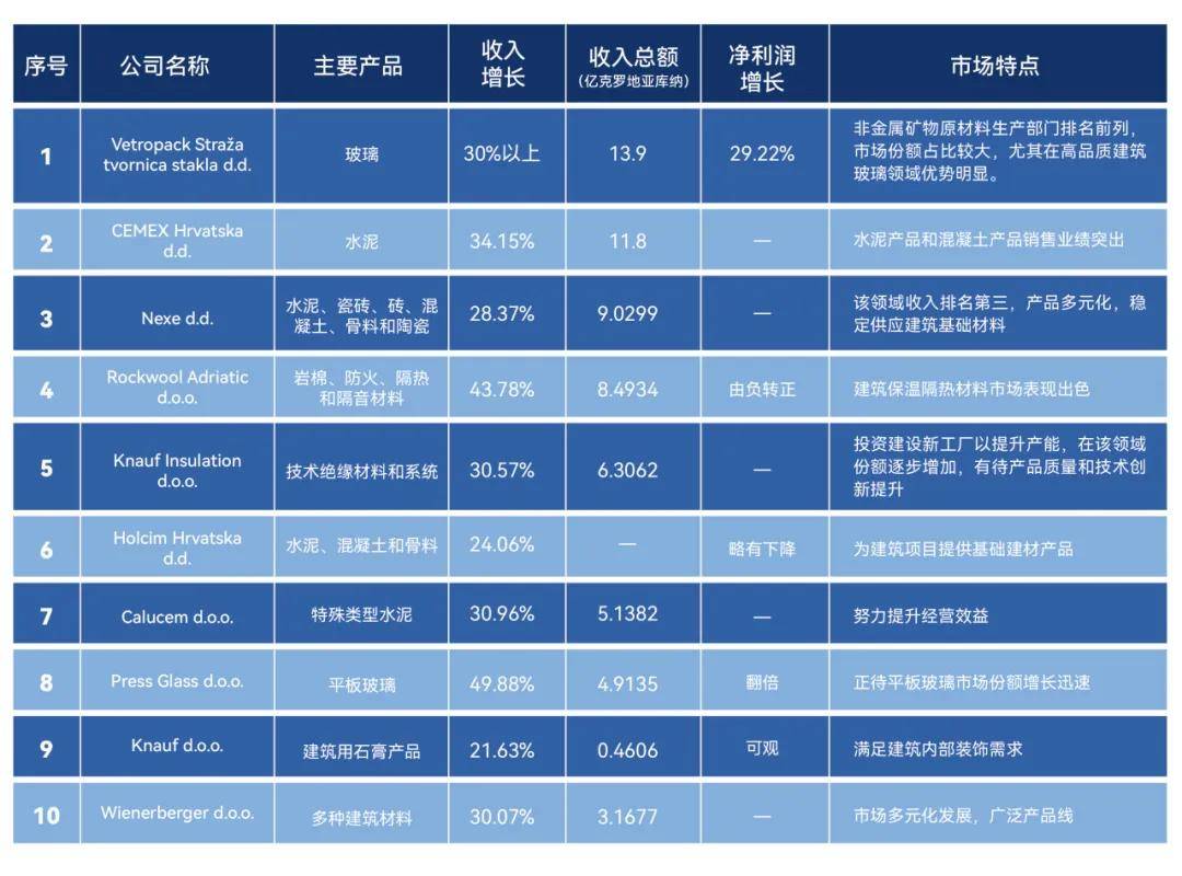 2022年克罗地亚十大建材制造商收入增长32%,行业总收入达73.6亿克罗地亚库纳。这些制造商在市场中各具特点: