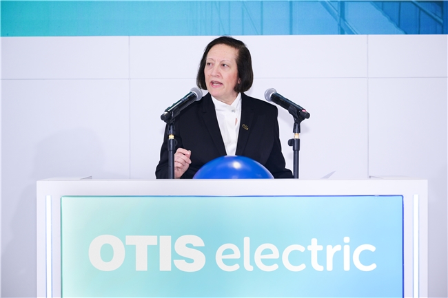 (奥的斯全球主席、首席执行官兼总裁朱蒂在新品发布会上致辞)