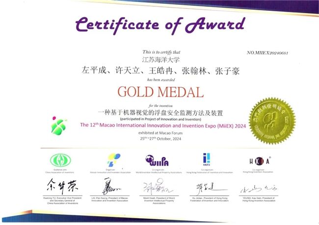 近日,2024年第十二届澳门国际创新发明展在澳门隆重举行。在这一盛大的创新盛会中,来自江苏省连云港市的一项石化安全领域发明专利——“一种基于机器视觉的浮盘安全监测方法及装置”,凭借其卓越的创新性和实用性,从众多参展专利中脱颖而出,荣获金奖。