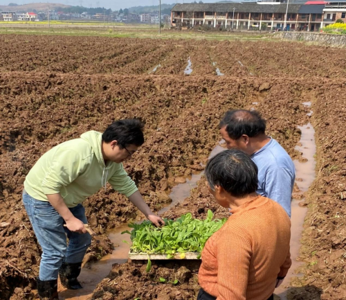 “刘叔,我看你田里长势不错,但是有些小苗和弱苗要注意施点‘偏心肥’,确保后期长势一致啊。”