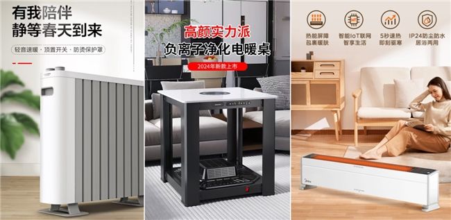速暖防烫油汀,采用封闭式对流设计,取暖效果更好,封闭式油汀有效防烫,还有倾倒断电、三档温度调节贴心等功能。负离子净化电暖桌,采用下发热模式更利于热量散播,实现全屋覆盖式持续供暖,除了多人围桌取暖的同时,还能在桌上烹饪,搭载百万级负离子净化器,净烟、抑尘、抑菌、祛甲醛。采用了石墨烯材料的美的踢脚线取暖器,在升温效率、全暖范围、省电节能等方面均有明显提升,IP24级防尘防水功能,使其应用场景更加广泛。