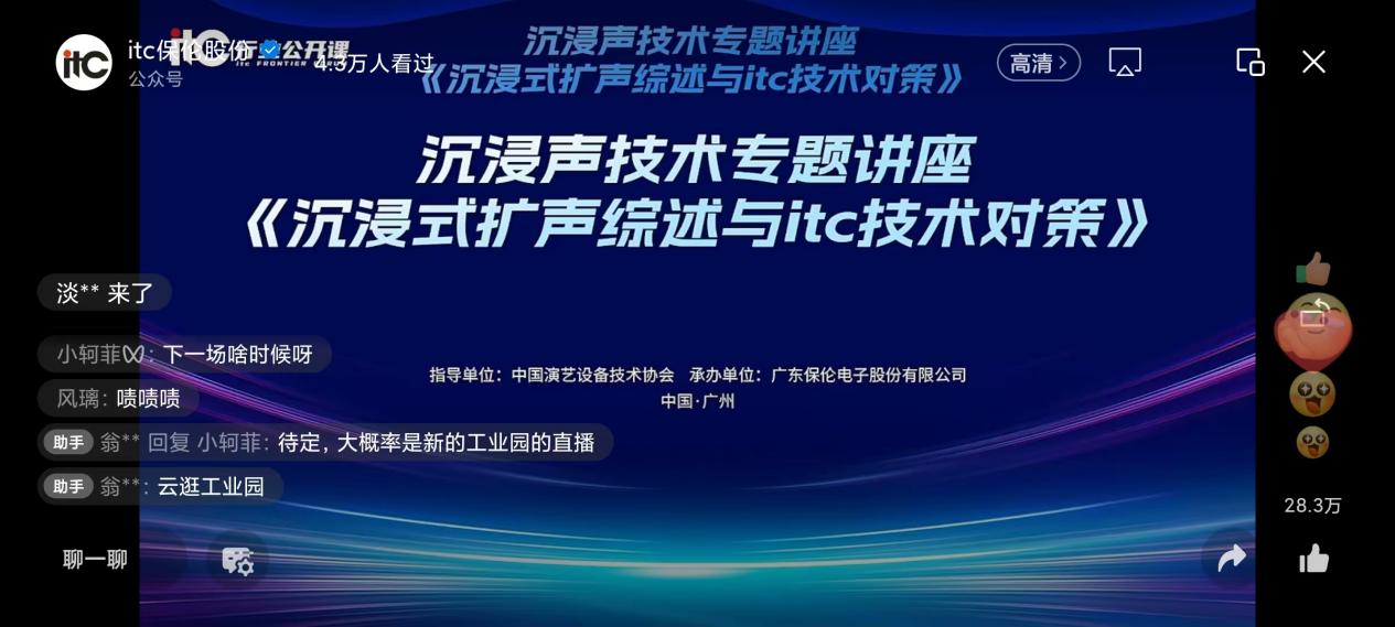 10月30日,以“沉浸式扩声综述与itc技术对策”为主题的itc行业公开课——沉浸声技术专题讲座在itc视频号重磅上线!本次公开课由中国演艺设备技术协会指导,广东保伦电子股份有限公司(简称“itc保伦股份”)承办,特邀北京工业大学剧场设计与舞台技术研究所博士李国棋与itc保伦股份声学部总监何力争,共话沉浸式扩声技术!