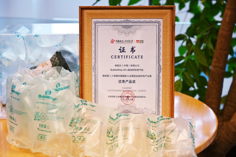 这其中,近期推出、荣获第24届中国国际工业博览会新材料产业展优秀产品奖的BubbleWrap® 95%高回料环保气枕,原材料(高密度聚乙烯HDPE)中55%为消费后回收料(PCR),40%为工业后回收料(PIR)。经第三方产品生命周期评价软件科学计算,与全新料相比,产品碳排放减少大约20%,化石能源和水资源消耗减少大约40%。此外,该产品放气后体积只有充气时的0.7%,便于压缩体积及回收再利用 。
