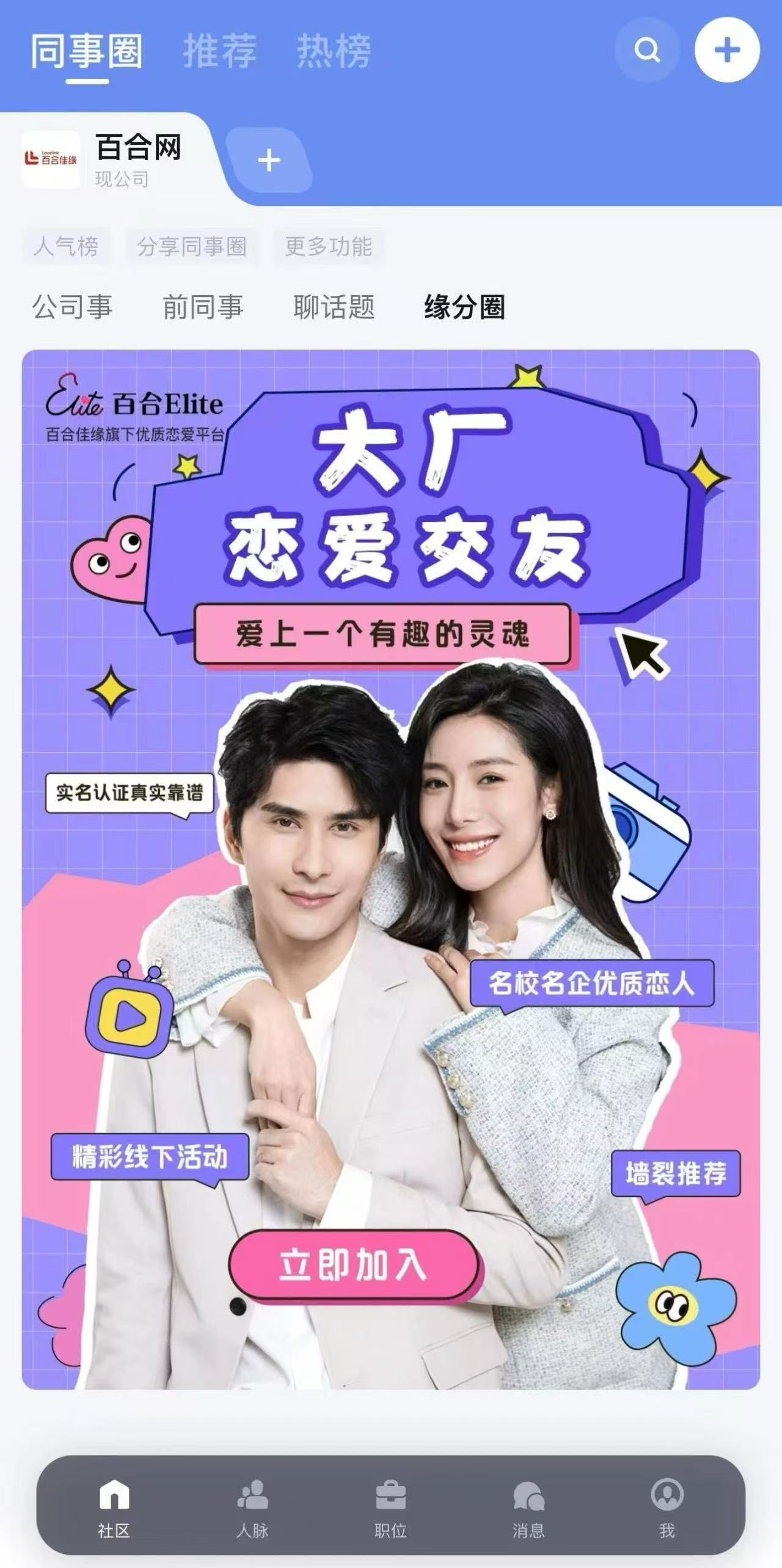 近日,百合佳缘集团旗下高端婚恋社交平台“百合Elite”与知名职场社区和社交平台“脉脉”达成深度合作。脉脉在其“同事圈”内新增“缘分圈”功能,实现与“百合Elite”小程序的联动。该功能已于10月30日起在脉脉APP上线。此次合作不仅标志着百合佳缘集团在婚恋社交领域的又一次重要创新,也标志着百合佳缘集团与脉脉的强强联合,共同推动高质量婚恋社交发展的新起点。