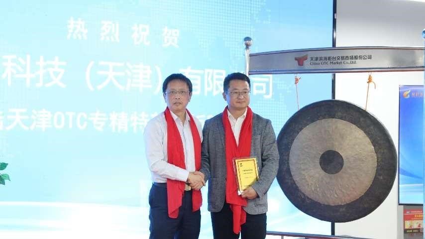在挂牌仪式环节,天津云创科技有限公司成功登陆天津OTC专精特新专板。企业代表佩戴象征喜庆的红围巾,与天津OTC副总经理何亮共同鸣锣揭牌,开启了企业发展的新篇章。