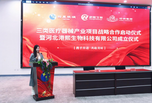 此次活动标志着双方在医疗器械领域的深度合作,以及河北港熙生物科技有限公司的正式启航。沧州四星玻璃股份有限公司董事长王焕一先生、沧润制药法人王文竹女士及总经理张岩先生、港熙集团董事长张胜男女士及总经理刘军先生等领导嘉宾出席仪式并致辞。