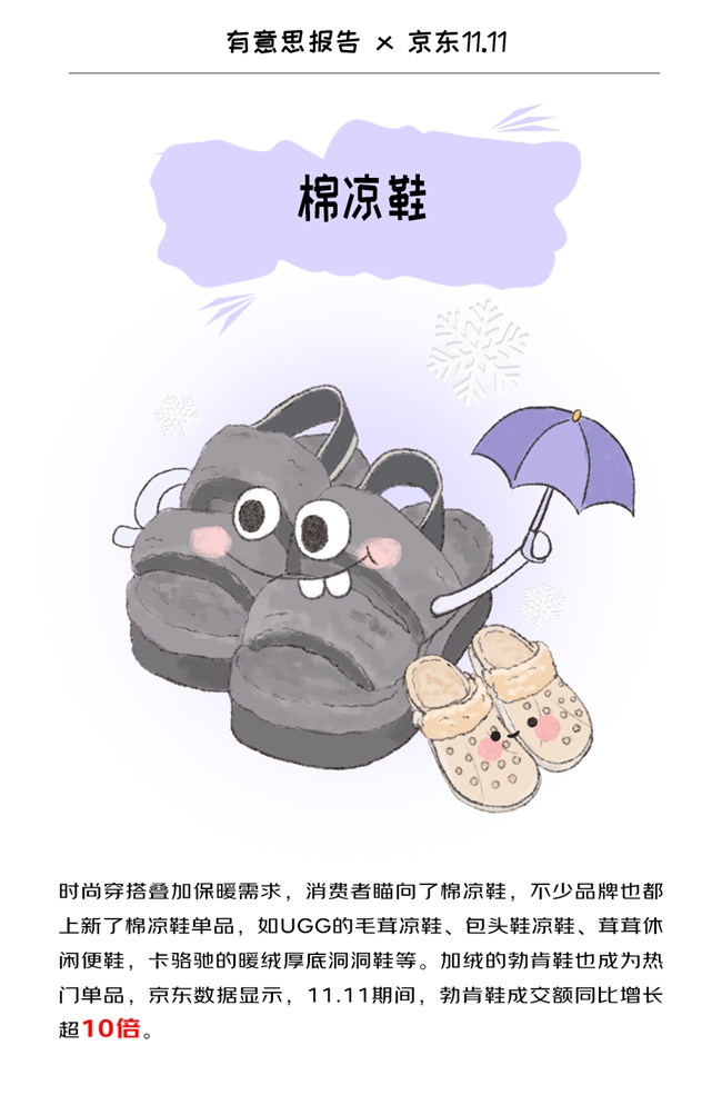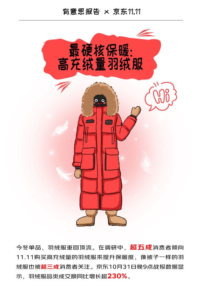 11·11期间,京东消费及产业发展研究院结合调研数据、消费数据盘点今冬服饰消费热点,高充绒量羽绒服、裸感保暖内衣、毛线护膝/堆堆袜、羽绒背心、连帽围巾/连帽脖套、棉凉鞋成为消费者最青睐的“显眼包”过冬神器。