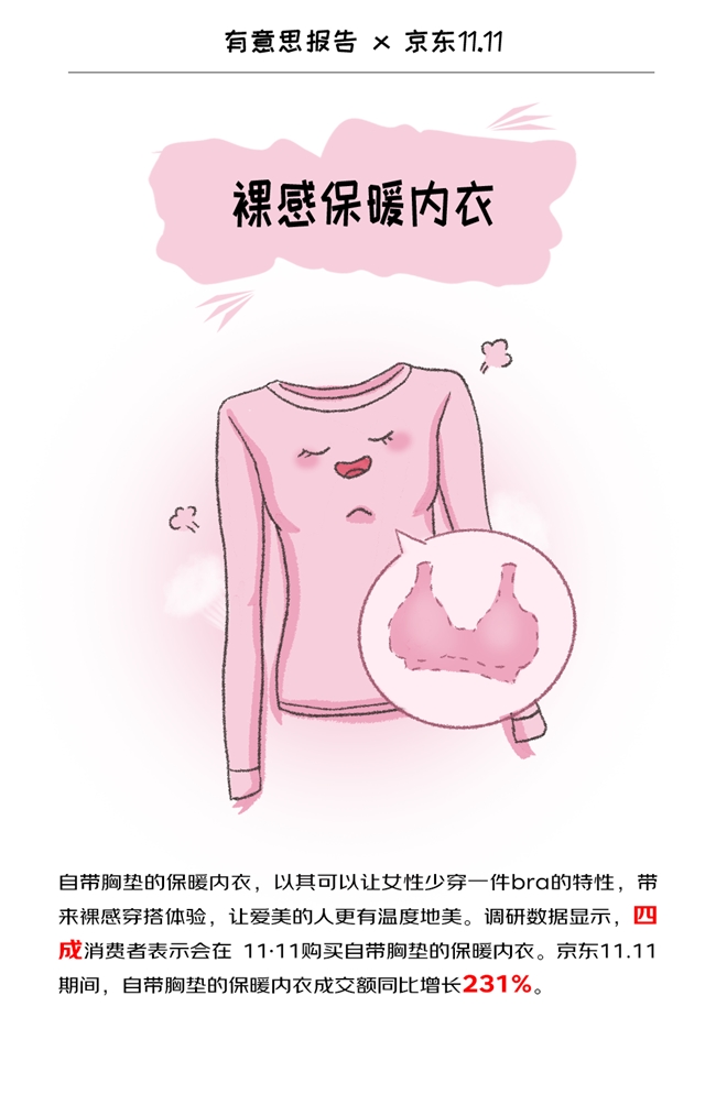 京东11·11期间,自带胸垫的保暖内衣成交额同比增长231%,蕉内热皮502++保暖内衣、猫人羊绒蚕丝保暖内衣等产品受到消费者的青睐。