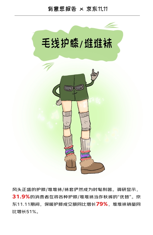今年,护膝/堆堆袜有望成为新晋保暖单品。调研显示,31.9%的消费者在将各种护膝/堆堆袜当作秋裤的“优替”。 京东11.11期间,保暖护膝成交额同比增长79%,堆堆袜销量同比增长51%。不管是软糯的毛线护膝、隐形又贴心的硅胶护膝,还是保暖不臃肿的堆堆袜,简直是腿部膝盖的“私人定制”,哪里需要暖哪里。