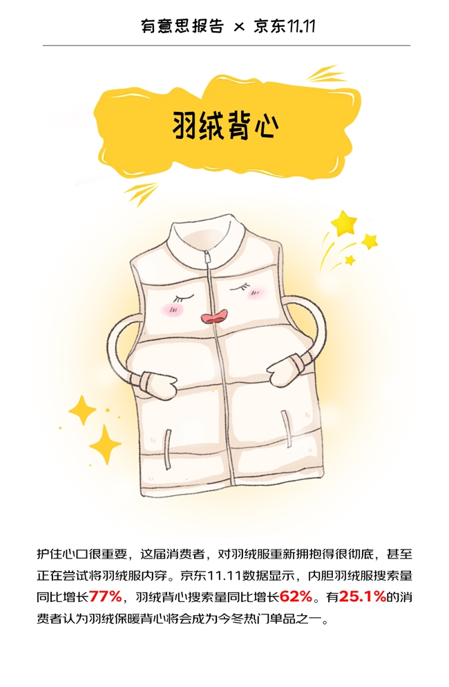 无论是都市职场风、混搭街头风还是户外休闲风,羽绒背心轻松拿捏想时尚又怕冷的问题。京东11.11期间,内胆羽绒服搜索量同比增长77%,羽绒背心搜索量同比增长62%。有25.1%的消费者认为羽绒保暖背心将会成为今冬热门单品之一。
