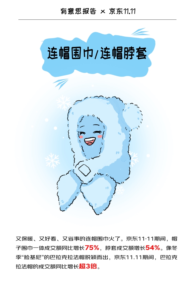 又保暖、又好看、又省事的连帽围巾,就这么火了。脖子和头一起保暖的同时,还能在不同颜色下穿出不同风格。京东11.11期间,连帽围巾/连帽围脖的帽子围巾一体成交额同比增长75%,脖套成交额同比增长54%,成为所属类目下增长迅猛的单品。