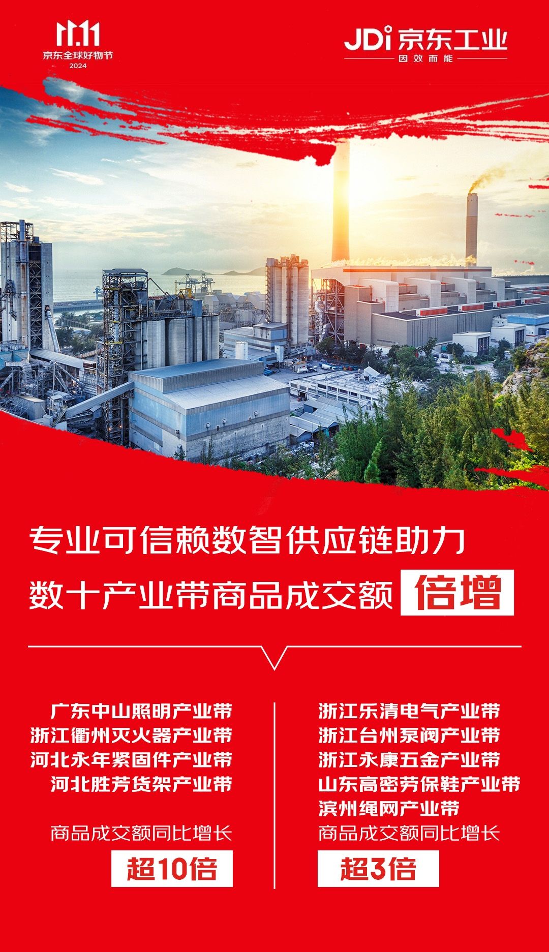 不仅是温州乐清,今年11.11,在京东五金城实现成交额倍增的产业带遍布全国,广东中山照明产业带商品成交额同比增长14倍、浙江衢州灭火器产业带商品成交额同比增长超10倍、浙江台州泵阀产业带和永康五金产业带商品成交额分别同比增长4.5倍和3.7倍。除了地处华南华东的传统优势产业带,来自河北的永年紧固件产业带和河北胜芳货架产业带商品成交额同比增长均超10倍,山东高密劳保鞋产业带和滨州绳网产业带商品分别增长5倍和4.8倍,通过“你做生产、我做供应链”的合作模式,京东工业与越来越多的产业带商家共同成长。