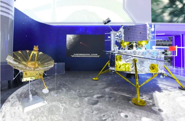 图:嫦娥六号着陆上升组合体1-1模型和鹊桥二号中继星1-3模型。来源:航天五院