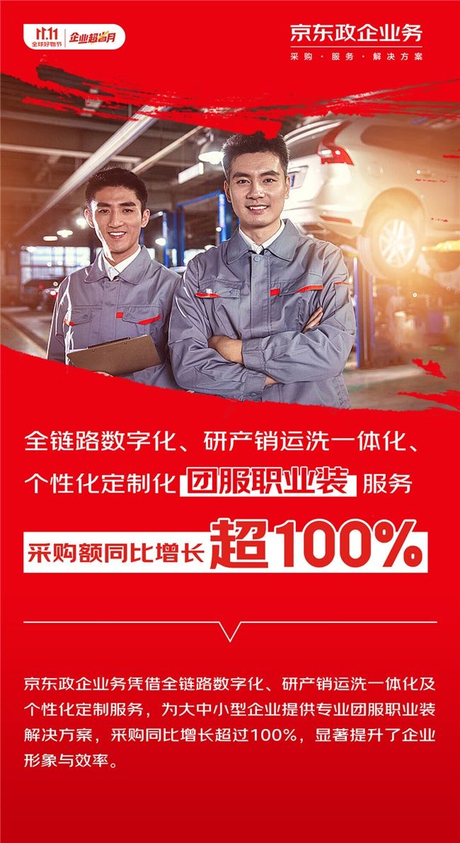 定制服务也在11.11期间受到了大量企业的关注。京东政企业务凭借全链路数字化、研产销运洗一体化打造的专业团服职业装解决方案,让采购人不仅可在线添加企业名称、LOGO等个性化信息,还可随时联系专业客服,享受一对一的定制方案设计服务,实现一键采购下单,一件起定,最快211时效送达。11.11期间,团服职业装定制采购额同比增长超过100%。