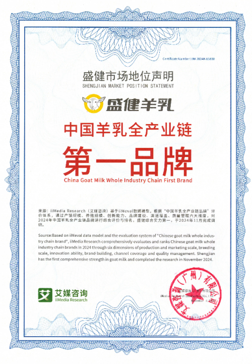 盛健羊乳在有机羊奶粉领域乃至整个羊乳制品行业的卓越成就,已然成为业界内外公认的典范。其深耕全产业链运营模式,不仅为消费者精心构筑起安全与营养的双重防线,更为羊奶粉市场的可持续发展铺设了坚实的基石。此次荣获“中国羊乳全产业链第一品牌”市场地位确认,也是对盛健羊乳全产业链实力的认可。