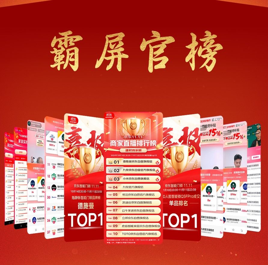 与此同时,这个双11,德施曼智能锁拿下高端品牌销额&销量第一;全渠道销量同比增长140%,高端产品销量环比增长850%;并连续夺得多个电商官榜第一,包括抖音家装实时热卖品牌销额&销量双第一,京东建材商家直播排行榜第一等官方榜单,强势领跑,持续屠榜,提前锁定2024全年销冠!