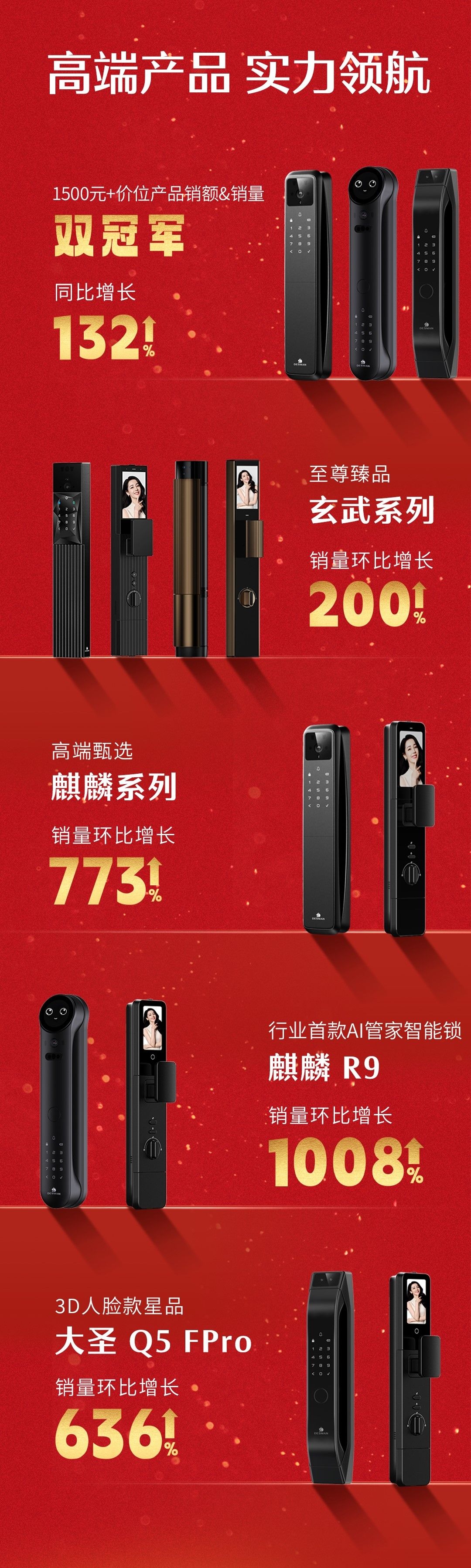 德施曼高端玄武系列,销量环比增长200%;麒麟系列销量环比增长773%;其中,行业首款AI管家智能锁麒麟R9销量环比增长1008%;3D人脸款星品大圣Q5 FPro销量环比增长636%!