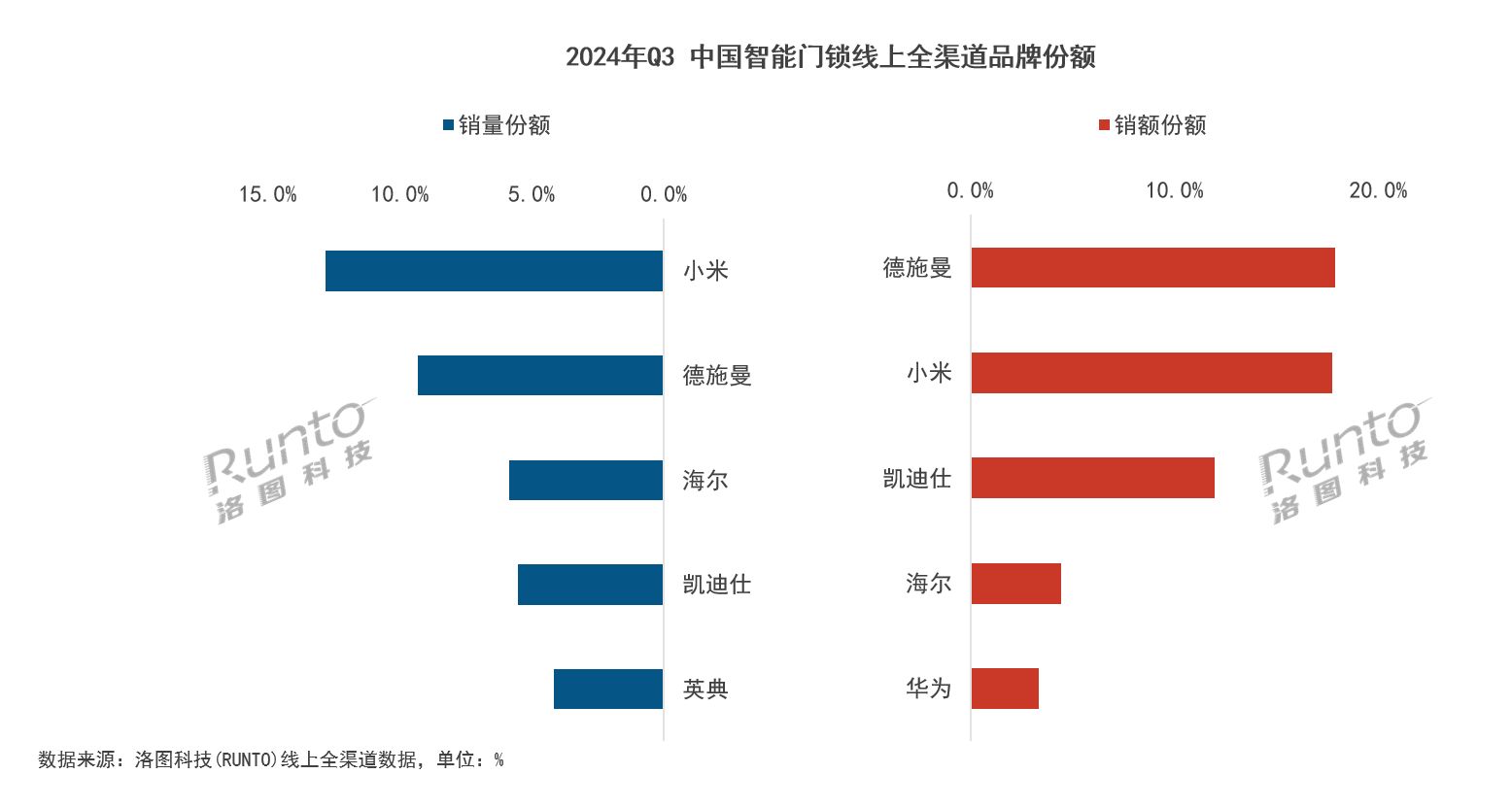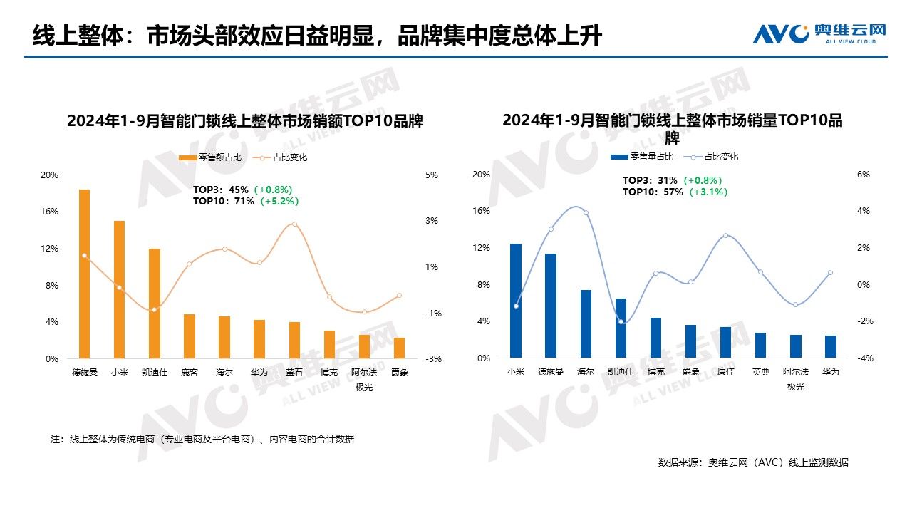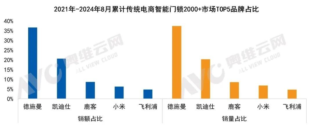 此前,根据行业权威机构奥维云网最新发布的2024年1-9月智能门锁行业报告显示,德施曼高端智能锁在2024年1-9月的线上整体市场中表现突出,以18%的零售额占比位居线上整体市场的首位。