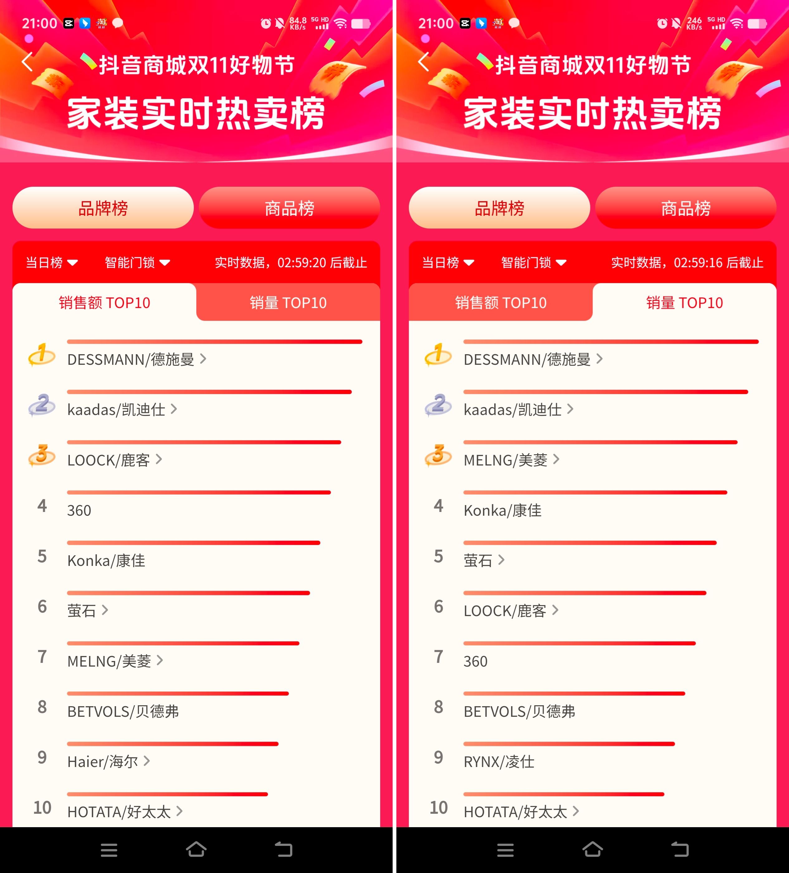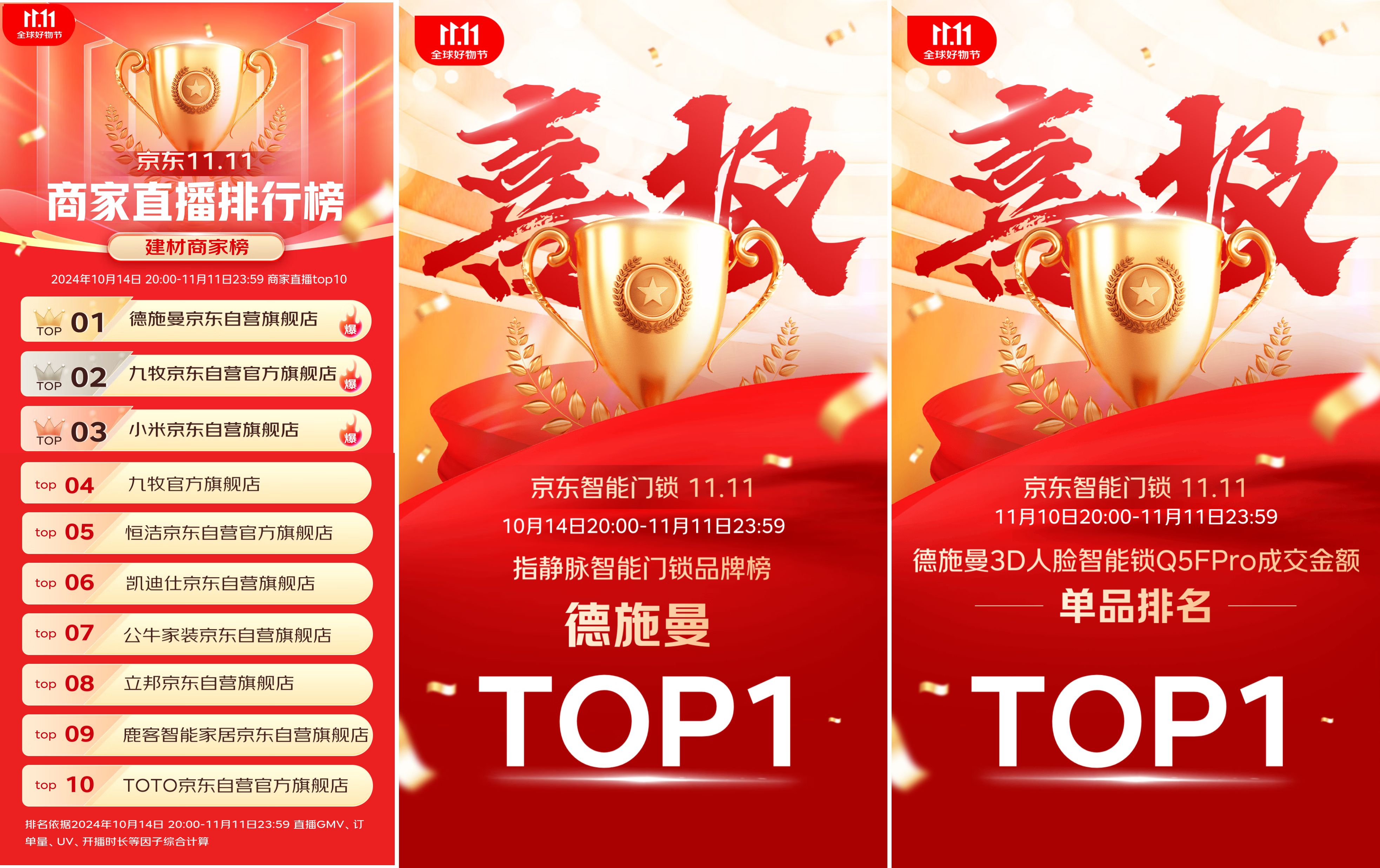 这个双11,德施曼智能锁拿下多个电商官榜第一,以实力获得消费者认可。其中,德施曼在京东平台拿下建材商家直播排行榜第一,3D人脸智能锁Q5FPro单品成交额排名第一,指静脉智能门锁品牌榜第一;在抖音平台拿下家装实时热卖品牌榜销额&销量双第一……
