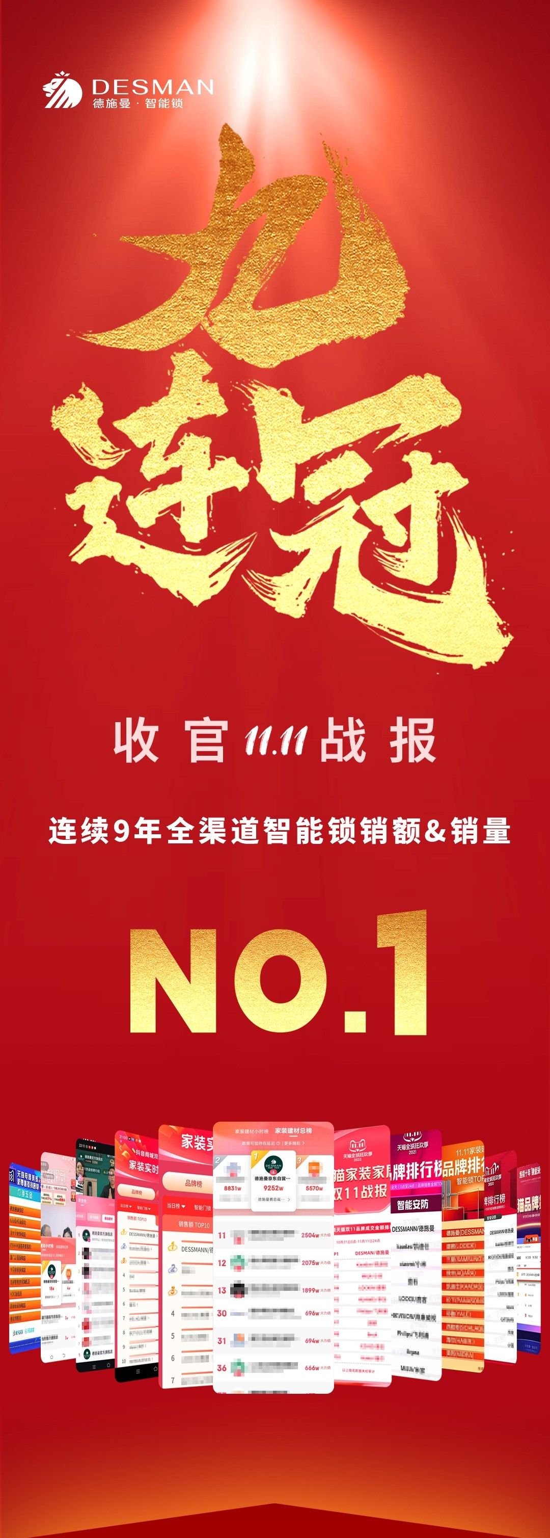智能锁领军品牌德施曼在这个双11再次跑赢同行,截至2024年11月11日凌晨,德施曼已经连续九年,拿下智能锁全渠道销额&销量第一!