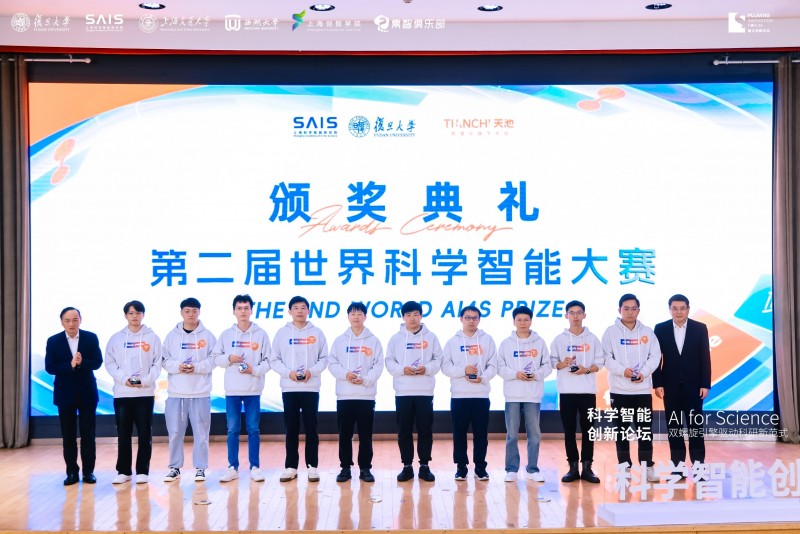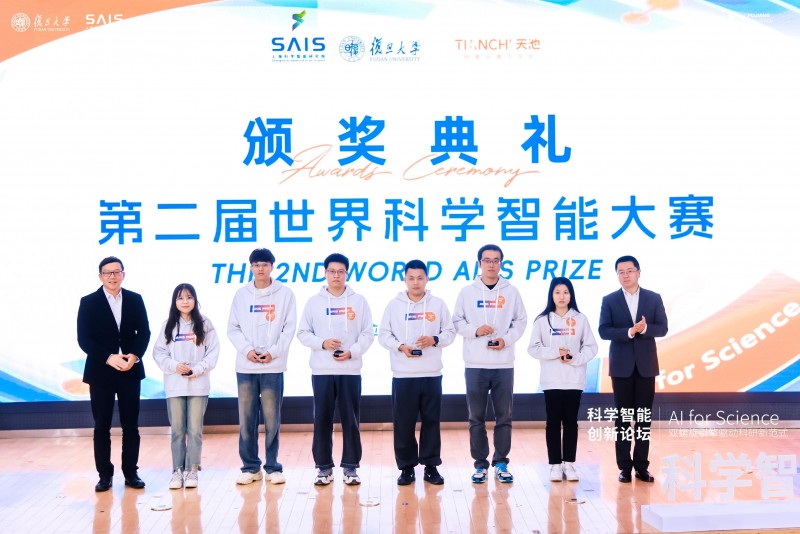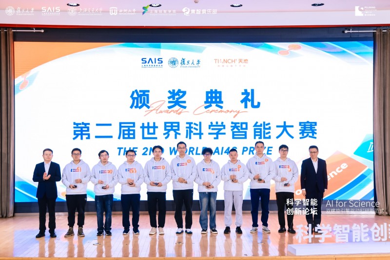 随后,复旦大学党委书记裘新,中国科学院院士、北京科学智能研究院理事长、北京大学国际机器学习研究中心主任鄂维南上台,为五大赛道的总决赛冠军团队,逐一颁发了一等奖的奖杯与获奖证书。荣获一等奖的团队分别是来自生命科学赛道的单排上分好难啊团队、来自地球科学赛道的Follow团队、来自物质科学赛道的zw团队、来自社会科学赛道的解密团队,以及来自逻辑推理赛道的leejt团队。