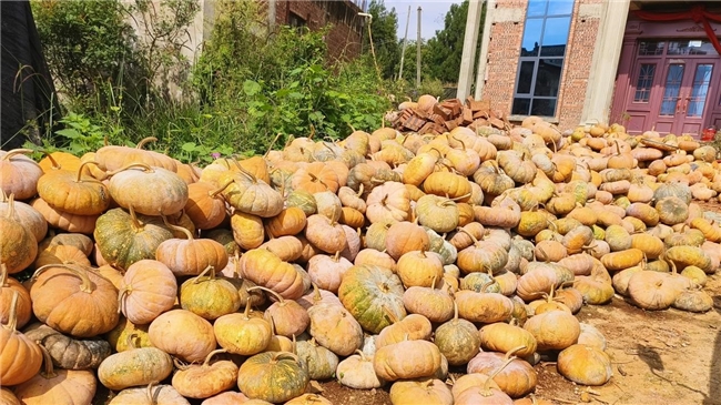 沿村道行走约莫五分钟,便来到了村民卢绕芬家,院子一角堆满了南瓜,“今年雨水调匀,南瓜产量比往年高。”卢绕芬说。