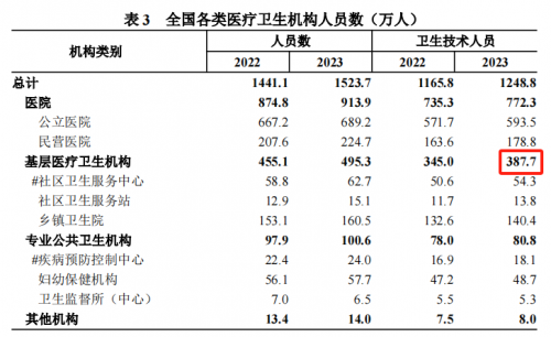 2023 年末,全国各类医疗卫生机构总人员1248.8 万人 ,其中基层卫生医疗机构人员(不含县级)数量为387.7万人。