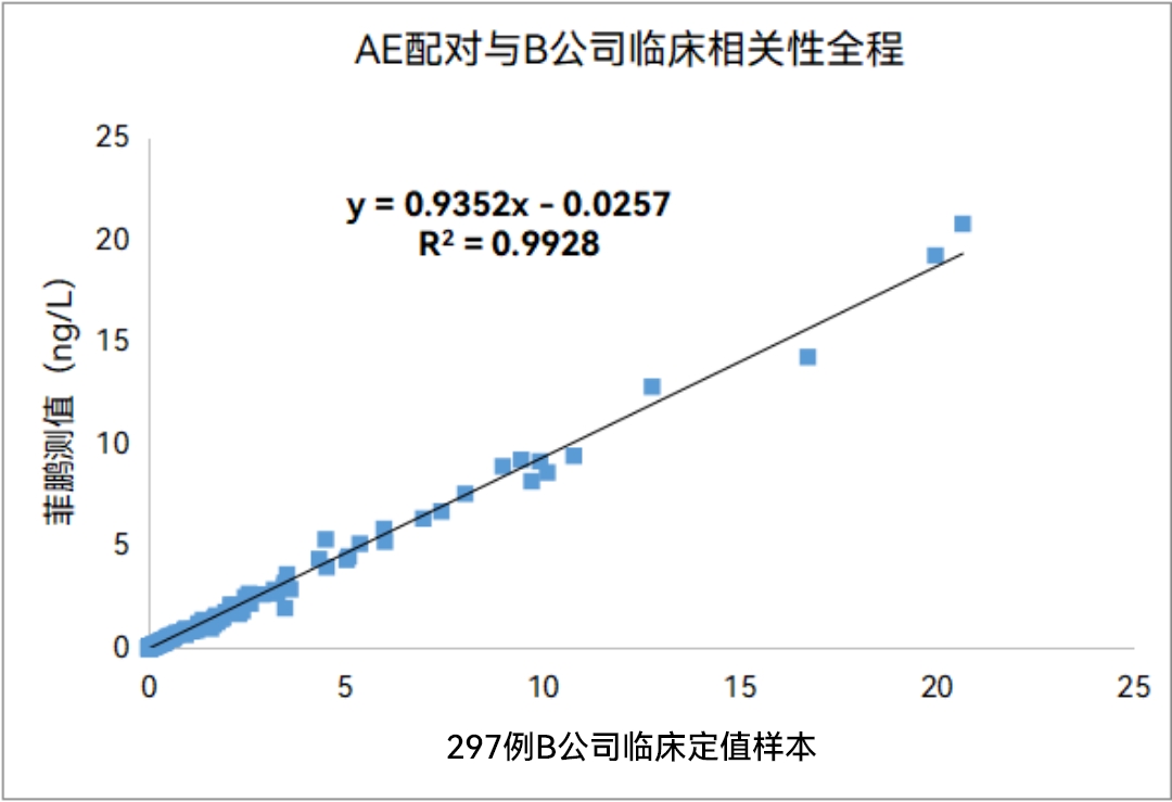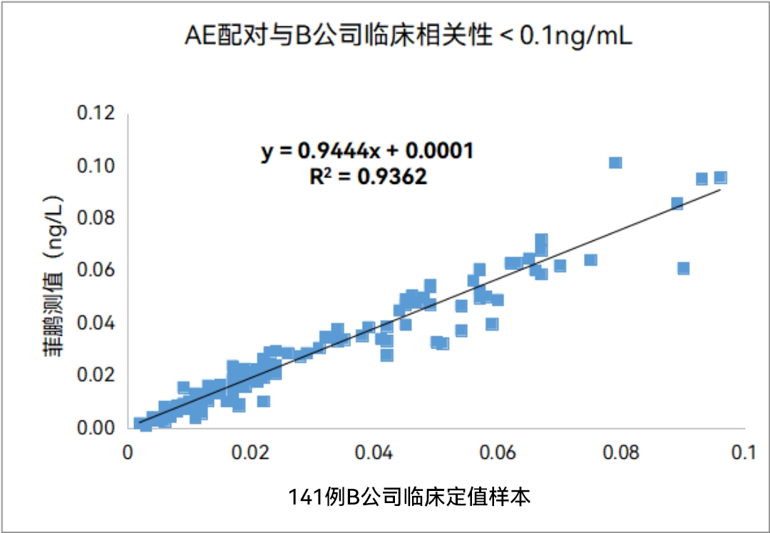 AE平台全区段相关性达到0.9928(297例样本);<0.1 ng/mL相关性达到0.9362(141例样本)