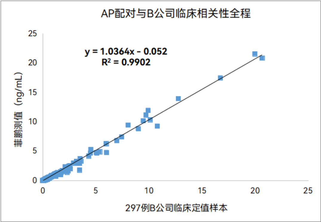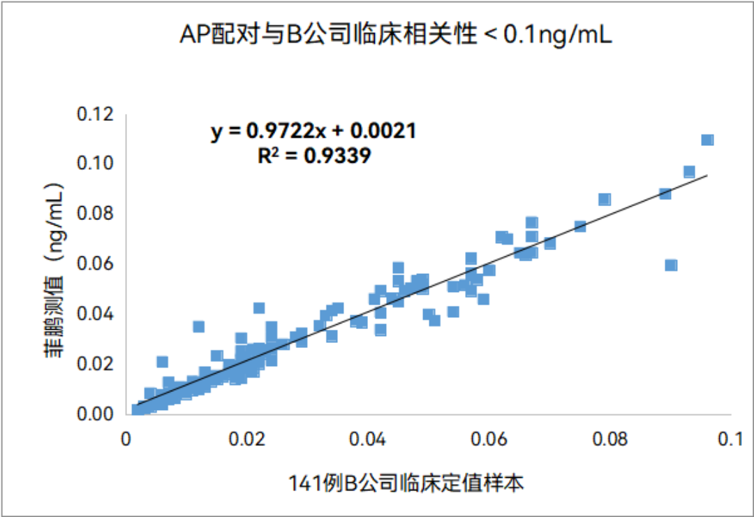 AP平台全区段相关性达到0.9902(297例样本);<0.1 ng/mL相关性达到0.9339(141例样本)