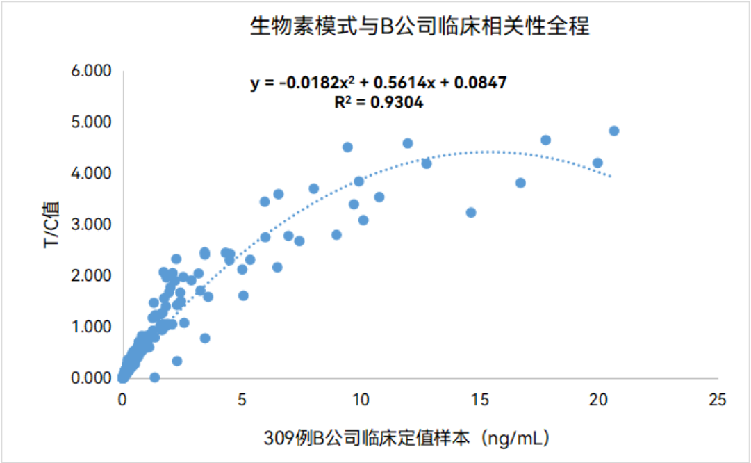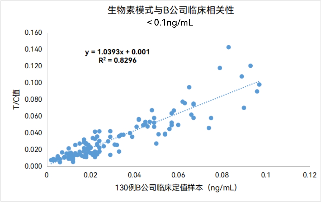 荧光平台生物素全区段相关性达到0.9304(309例样本);<0.1 ng/mL相关性达到0.8296(130例样本)