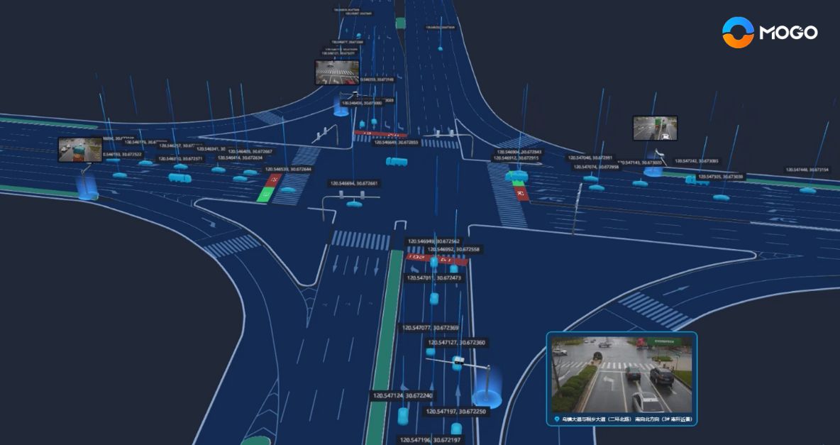 作为桐乡车路云一体化建设的核心合作方,蘑菇车联在位于乌镇大道与二环北路的交叉口铺设了具备“通感算”能力的AI数字道路基站(MOGO AI Station),并与路侧感知系统(MRS)相互配合,能够全天候、不间断、无死角地获取路口300米范围内所有交通参与者的动态信息,实时构建数字孪生系统,为范围内所有车辆提供实时数据服务,目前该数字孪生路口已正式投入运行。
