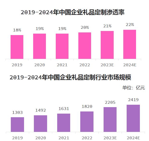 企业定制礼品的应用场景既有公司宣传、节日礼赠、也有商务拜访、会议活动,还有年节福利、年会、周年庆或入职礼包、团建等,企业定制礼品已经渗透到企业经营的各个环节。根据行业综合判断,礼品定制市场目前整体规模占两成以上(约2400亿),并持续增长。大中小型民营企业礼品定制需求更加强烈,达到或超过50%。