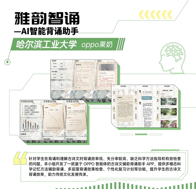 竞赛特等奖的获奖者,来自于哈尔滨工业大学的开发团队,其带来了《雅韵智诵——AI智能背诵助手》。这款应用通过OPPO智能体进行开发,可以为学生提供多模态科学记忆方法辅助背诵、还能进行多层面背诵效果检查、制定个性化复习计划等,可以有效提升学生的古诗文背诵效率。
