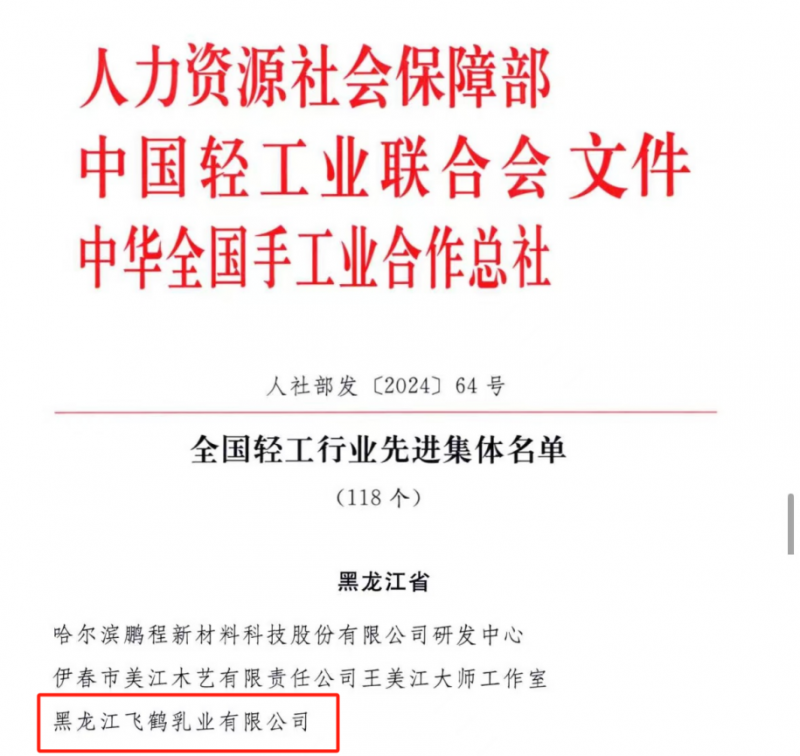 近日,人力资源和社会保障部、中国轻工业联合会、中华全国手工业合作总社联合发布《关于表彰全国轻工行业先进集体、劳动模范和先进工作者的决定》。在此次表彰中,黑龙江飞鹤乳业有限公司(以下简称“飞鹤”)荣获“全国轻工行业先进集体”称号。这一荣誉不仅是对飞鹤在轻工行业领先地位的肯定,更是对其科技创新能力和社会责任的充分认可。