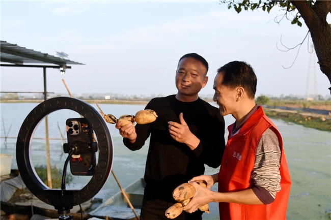 直播过程中,小陈邀请了大房新村的村支书孙书记来到直播间,为大家详细介绍汉川市的莲藕。