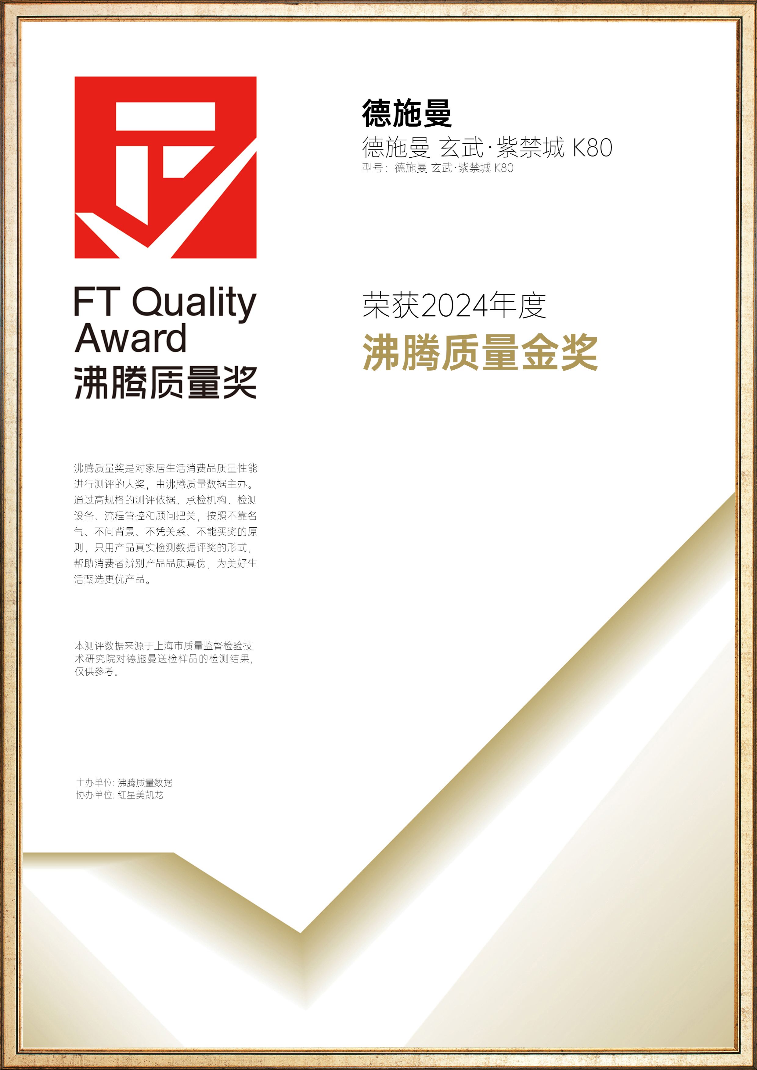在本次年度测评中,有近500款产品竞相角逐。德施曼高奢旗舰款玄武?紫禁城K80与小米、九牧、海尔等知名品牌共同斩获“2024年度沸腾质量金奖”!