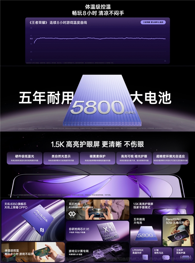 OPPO Reno13系列搭载天玑8350旗舰处理器,在强劲性能表现的同时实现更低功耗。配备体温级散热系统和全局智能控温算法,确保长时间高负载运行时依然保持稳定性能输出和温度控制。全系标配LPDDR5X高速运存,在提升传输速度的同时降低能耗,显著改善游戏流畅度和续航表现。
