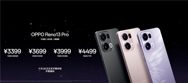 OPPO Reno13 Pro提供12GB+256GB(售价3399元)、12GB+512GB(售价3699元)、16GB+512GB(售价3999元)、16GB+1TB(售价4499元)四种存储版本,有蝶蝶紫、星光粉、午夜黑三款配色可选。