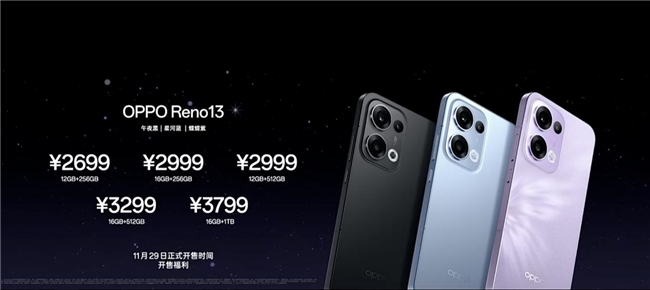 OPPO Reno13提供12GB+256GB(售价2699元)、12GB+512GB(售价2999元)、16GB+256GB(售价2999元)、16GB+512GB(售价3299元)、16GB+1TB(售价3799元)五种存储版本,有蝶蝶紫、星河蓝、午夜黑三种配色可选。