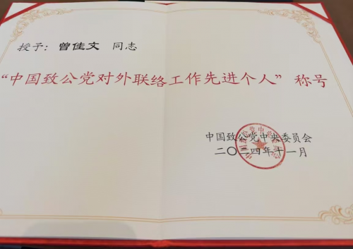 2024 年 11 月 14 日至 15 日,中国致公党对外联络工作会议在安徽合肥召开。会议对在对外联络工作中表现突出的集体与个人进行了表彰,曾佳文荣获“中国致公党对外联络工作先进个人”称号。