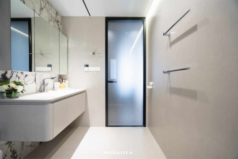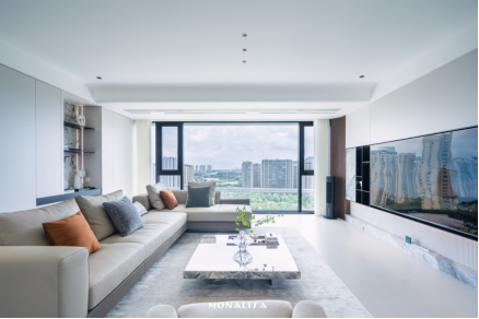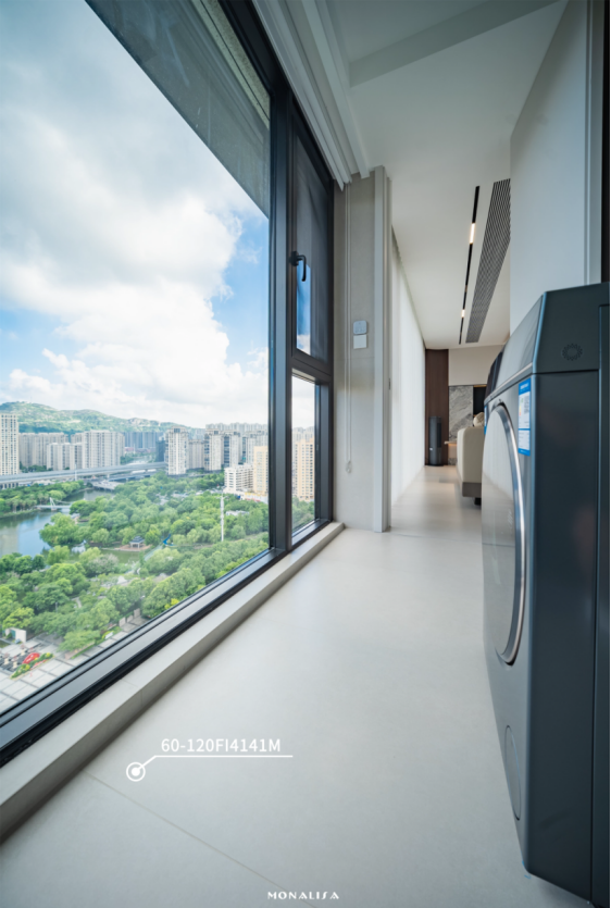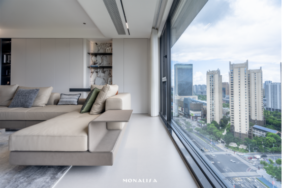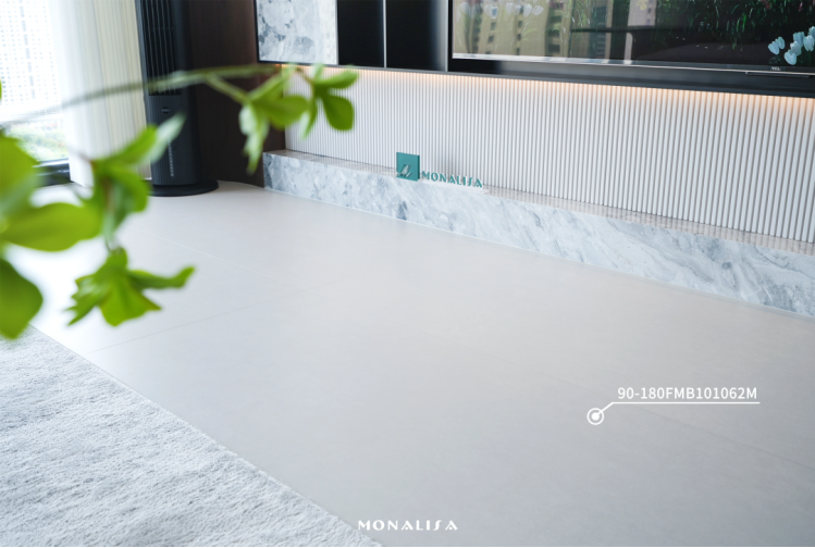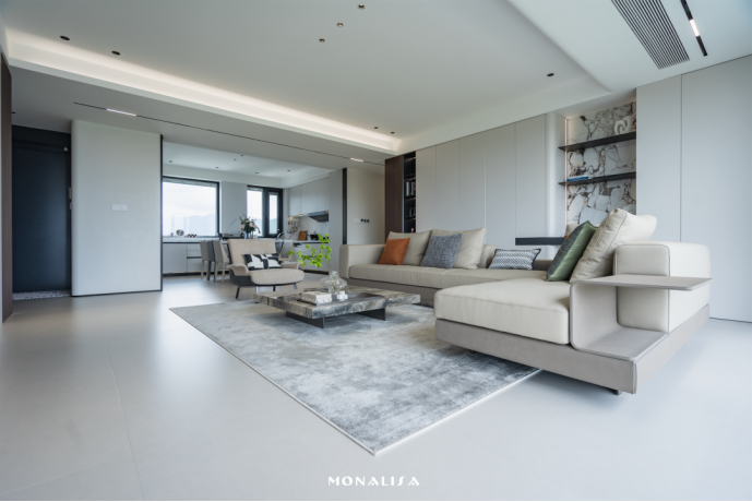 地面通铺蒙娜丽莎900×1800mm规格素色陶瓷大板,素净而低调的色调营造柔和自然的观感。