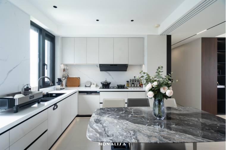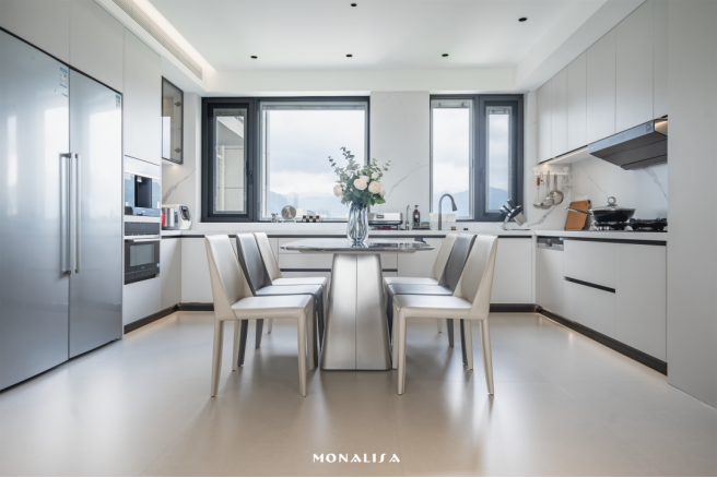 从客餐厅延伸至厨房铺贴的蒙娜丽莎素色陶瓷大板,铺贴缝隙少,减少藏污纳垢,让餐厨空间的清理变得更方便。
