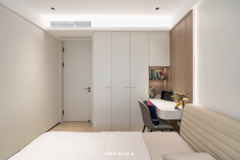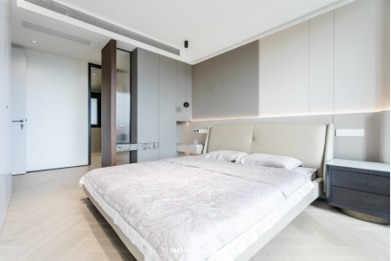 简洁的空间设计和一门到顶储物柜,在保障空间功能性的同时,使卧室氛围回归休憩、舒缓的主要需求。
