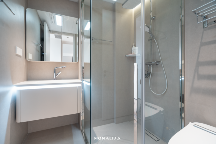 奉行“简约至上”的原则,主卧卫生间摒弃过度设计,以玻璃门为隔断划分淋浴区和洗漱区,保持空间的通透感。
