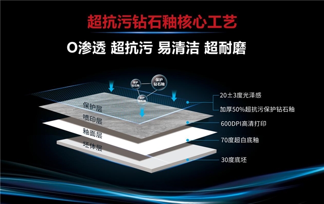 在超耐磨技术取得突破后,作为行业研发技术领军企业,大角鹿再度出手,“超抗污钻石釉”国家专利技术再次颠覆了行业,在瓷砖耐磨性能上再探高峰的同时,更真正意义上实现了瓷砖的超抗污能力。
