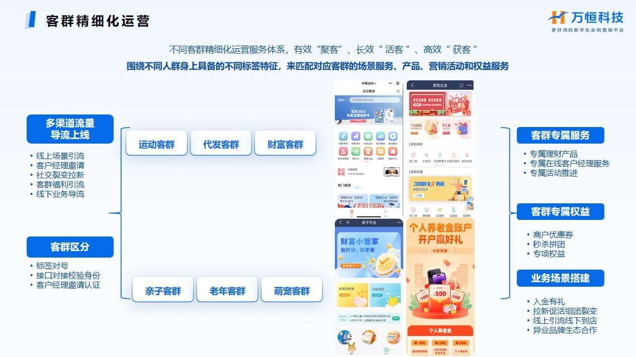 在此趋势下,万恒科技在十余载的持续深耕过程中,积极推动新技术赋能银行营销创新,深厚积淀成就了其在智慧营销领域的行业领先地位,长期服务了国有银行、股份制银行以及头部城商行的智慧营销平台建设,点滴实践锤炼出一系列盘活存量客户、触达持续营销的系统实施经典案例。把银行开进APP里,让金融服务无处不在,打破时间、场所、客户的界限,利用场景化权益、场景类活动、场景“沉浸式”营销,更好地实现拉新、促活和转化的目标。
