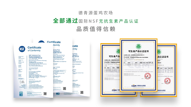 德青源在养殖方面,始终坚持“科学饲喂、健康管理”的高标准,采用纯天然饲料,德青源金牌初产可生食鲜鸡蛋在专业配方饲养和严苛生产标准的基础上,通过了NSF无抗生素认证和CQM可生食认证,从鸡的种源、鸡舍卫生、饲料饮水等方面进行严格检测,鸡妈妈们在健康、干净、无抗生素的环境中生活,从源头上确保鸡蛋的安全与营养。