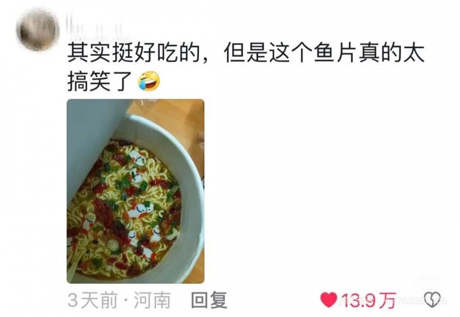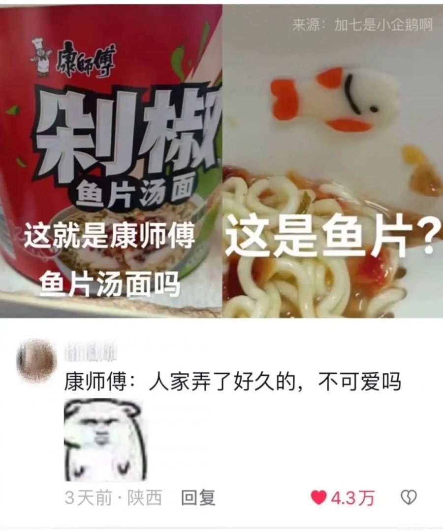再说回康师傅的“Q版鱼片”事件,为什么能让大家会心一笑?想象一下,辛苦工作一天回到家,想吃碗泡面充充电,打开盖子意外发现一条可爱“小鱼”,不期而遇的小确幸,简直把治愈感拉满。