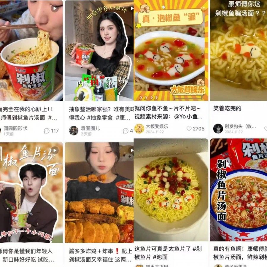 在食品板看来,无论是“有心”还是“无意”,从结果来说,康师傅这条“小鱼”确实戳中了很多人的心。很显然,康师傅也敏锐洞察并承接住了这波话题流量。在各大媒介平台,康师傅官方亲自下场,积极与广大消费者一起互动“玩梗”,在微博、小红书、抖音上不断掀起讨论热潮,并产生一波又一波趣味十足的UGC内容。截至目前,这条小“鱼”掀起的话题还在持续发酵,也助力剁椒鱼片汤面这款新品快速破圈,触达更多圈层人群。
